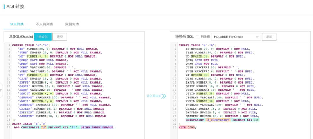 传统数据库迁移改造,DBA识别出不兼容的DDL,根据官方文档逐条改造调试。ADAM通过智能学习,自动识别Oracle和业界通用数据库的语法差异,并进行智能订正,以SQL染色的形式将订正的差异点进行高亮标识;通过对数据库对象依赖关系梳理,提供按顺序执行的智能订正的对象DDL;例如Oracle数据库迁移到PolarDB-O,通过ADAM智能订正后,已可以做到95%的兼容性,即95%的DDL无需客户做任何操作即可以直接使用,并且对于其他不能通过软件自动化转换的5%,ADAM也提供了详细的专家建议和改造示例,DBA可根据示例很轻松的进行订正。