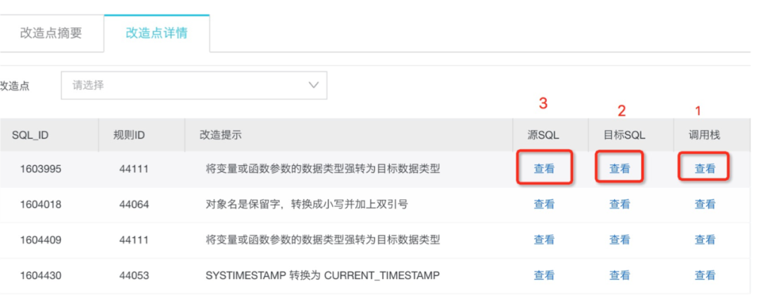 同时经过应用评估可识别出所有不兼容的SQL及代码中的具体定位,并智能修订为兼容的SQL,客户根据代码定位可以一次性修改所有不兼容点。