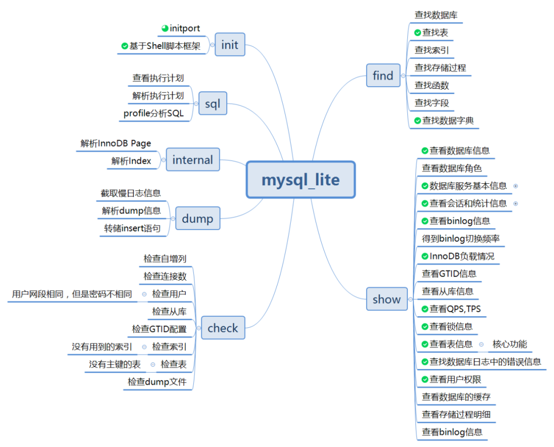 我来简单解释一下,整个脚本内容可以按照find,show,check这三个基本维度展开, find可以支持模糊匹配,精确查找,实现表,索引,字段层面的查找;show主要是对于一些对象和基本信息的展示,比如得到数据库的基本信息,得到binlog的基本信息,得到QPS等指标信息等;check是在这个基础上进一步完善的动作,我们可以实现一些快速检查工作,比如检查数据库中是否包含自增列溢出,检查用户权限,检查数据库中是否存在大量的短连接异常等,此外补充了dump,internal,sql等几个模块,就是在这些基本管理之上进一步让工具更加丰富起来,支持一些更实用有效的功能,目前来说仅仅完成了不到30%的工作量,还有很多内容规划出来了但是没有落地。