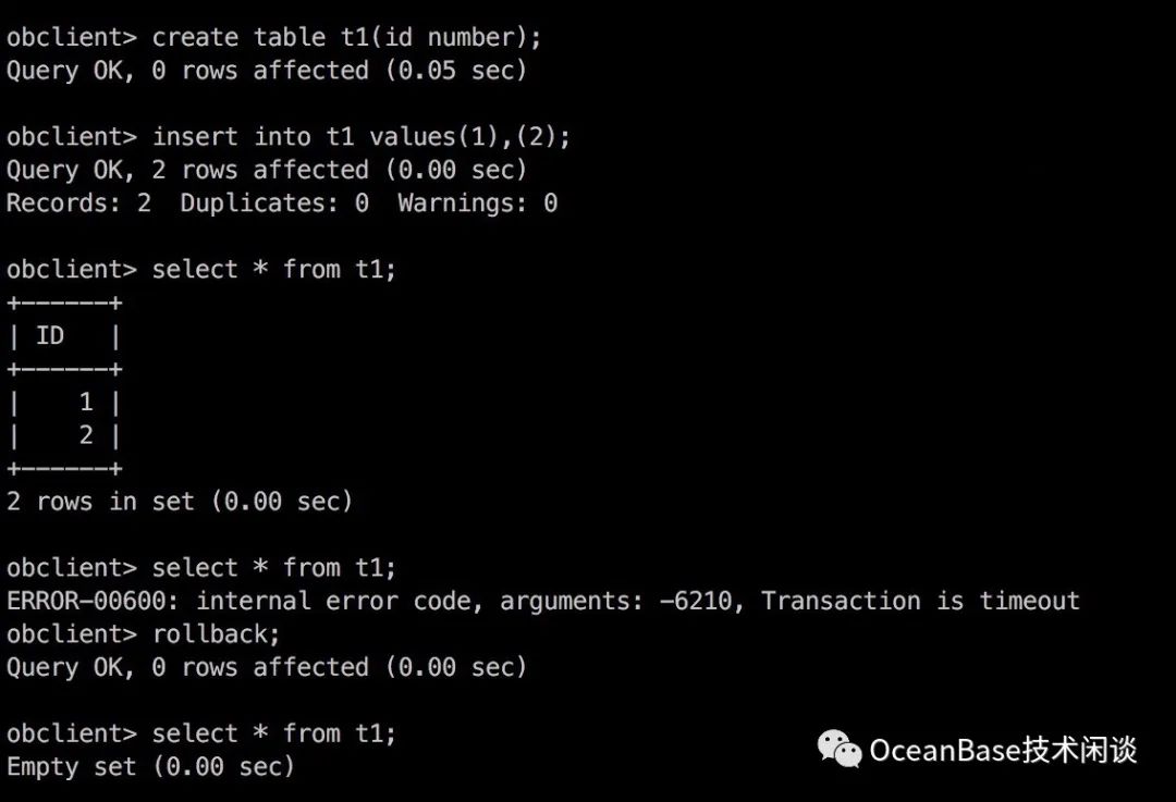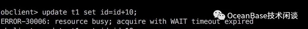 obclient> set global ob_query_timeout=1000000000; ERROR-00600: internal error code, arguments: -5036, Access denied; you need (at least one of) the SUPER privilege(s) for this operationobclient>obclient> set session ob_query_timeout=1000000000; Query OK, 0 rows affected (0.00 sec)obclient> show variables like 'ob_query_timeout';+------------------+------------+| VARIABLE_NAME | VALUE |+------------------+------------+| ob_query_timeout | 1000000000 |+------------------+------------+1 row in set (0.00 sec)obclient> update /*+ query_timeout(300000000) */ t1 set id = id+10 ;Query OK, 2 rows affected (0.00 sec)Rows matched: 2 Changed: 2 Warnings: 0obclient>obclient> select /*+ query_timeout(30000000) */ count(*) from t1;+----------+| COUNT(*) |+----------+| 2 |+----------+1 row in set (0.00 sec)obclient> set session ob_trx_lock_timeout=5000000; Query OK, 0 rows affected (0.00 sec) obclient> update t1 set id = id+10 ; ERROR-30006: resource busy; acquire with WAIT timeout expired obclient>