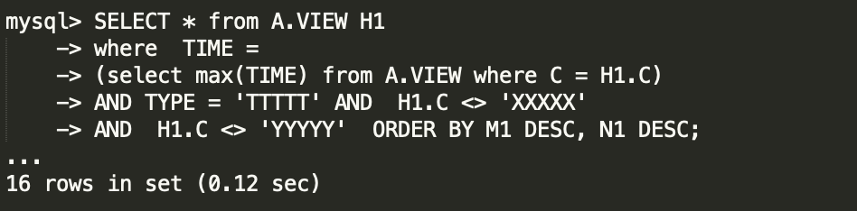 AND TYPE = 'TTTTT' AND H1.C <> 'XXXXX'