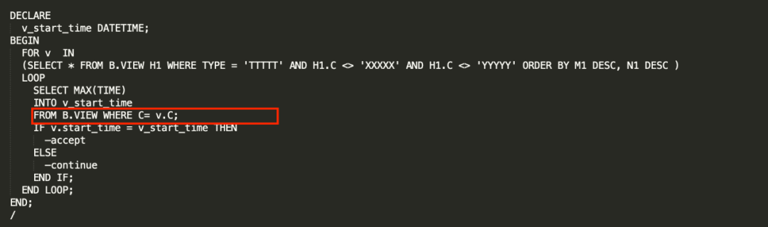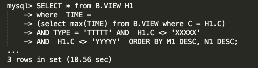 两个Schema下的查询对比,发现外层循环查出的记录数相差很小,那么性能差异肯定是取决于循环内层的子查询每次的执行所花的时间。即:select max(TIME) from B.VIEW where C = H1.C