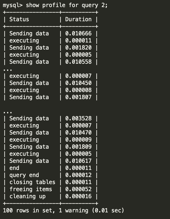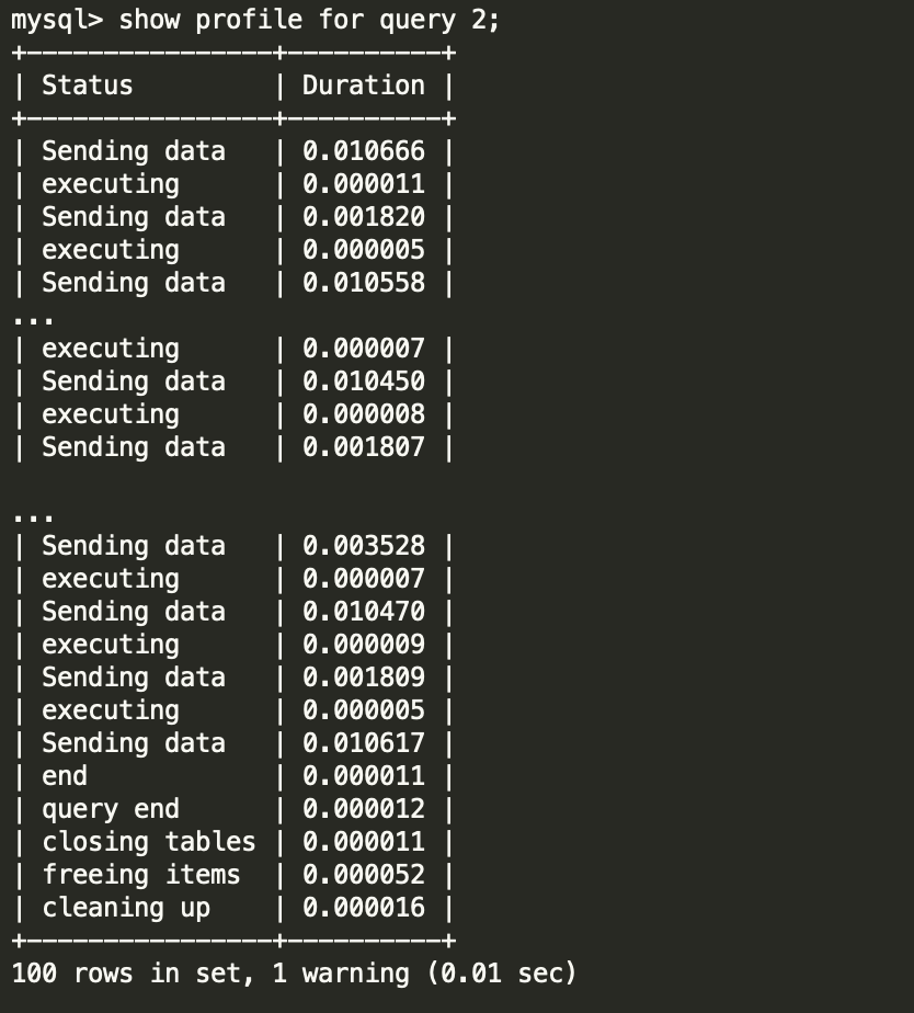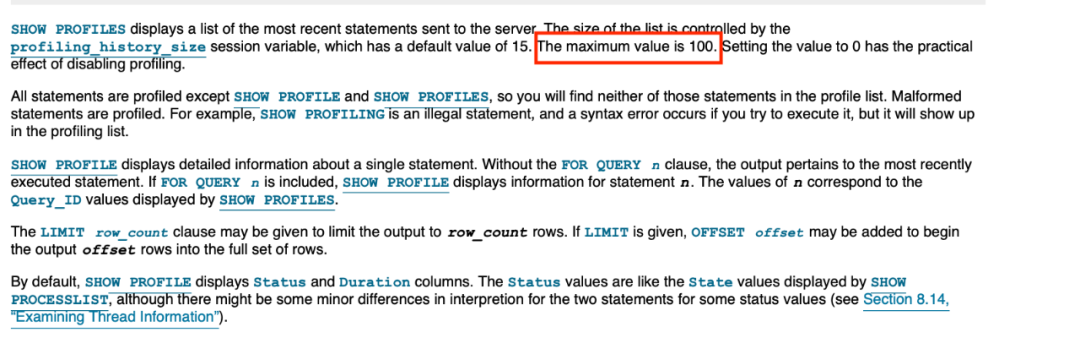 SHOW PROFILES列出了最近发送到服务端的sql语句。列表长度由变量profiling_history_size控制,默认值为15,最大值为100。官网只提了show profiles的限制,没找到show profile 相关内容,不过我测了一下,最多也只能显示100行。所以,0.35秒,只是累加了部分profile信息中的时间,并不是profile不准确。