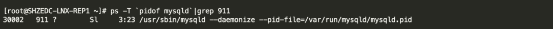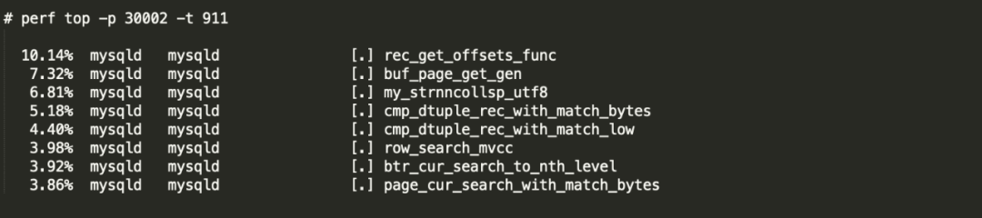 profile中所有时间基本都是0.0X秒,并且把所有时间加起来也就只有0.35秒左右,但是这个sql的执行时间怎么会需要11秒呢?到底是慢在了什么地方呢?三、通过strace跟踪,查看两条SQL的执行差异1. 先通过下面的语句,找到 os thread_id