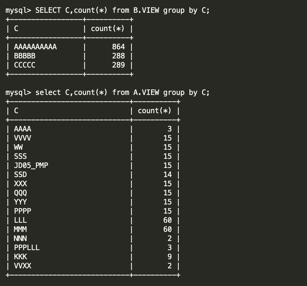 通过对两个结果集的比较,不难发现,数据量相差不多的情况下,SCHEMA B(慢查询),一个C记录最多对应有864条,最少的也有288条;而SCHEMA A下(快查询),最多的只有60条,基本集中在15条左右。由于VIEW还是一个视图,所以会放大执行时间。SELECT H1.* FROM B.VIEW H1,