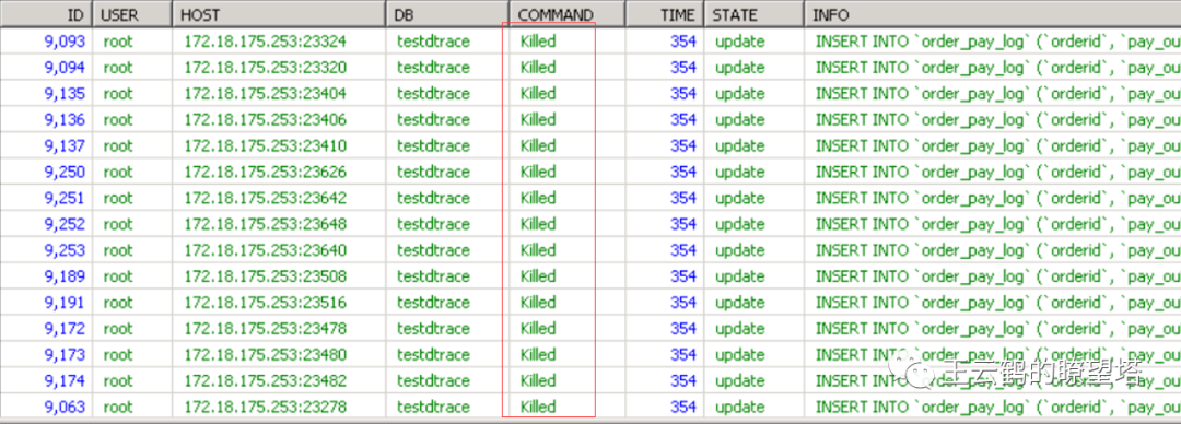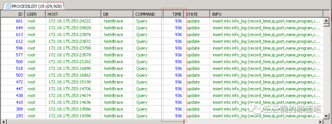 各位看完后一定很愤怒,CPU Util,CPU Load,磁盘IO和网络IO指标都很低,毫无性能压力的服务器指标,有啥好看的(其实是有指标异常的)。别急,在毫无波澜的服务器上,mysql实例内部已经翻山倒海了,请看下图:有接近三万的活动连接,所有的连接都是执行非常简单的单条insert语句。但是,这些sql语句,都已经执行了十多分钟还未结束。而且再过不到十分钟,mysql实例将实现自我涅槃(自动重启)。某日,业务开发突然反馈,应用出现大量无法建立新连接的报错。登录上mysql实例发现,最大3万的连接数,已经满的不能再满了。实例中全部都是活动连接