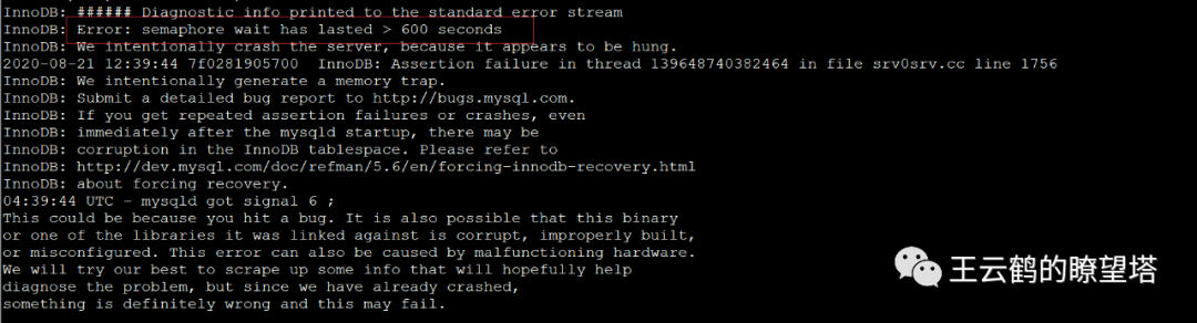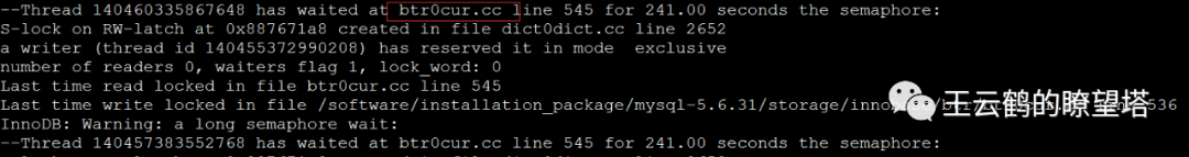 普通的ssd服务器,几万qps的插入肯定是没问题的,这么好的机器(112核CPU,256G内存,磁盘PCIE SSD),几十万的qps应该不在话下吧,好歹PCIE SSD比普通ssd磁盘至少有10倍的读写提升,难道就撑不住这些业务量吗?等等,这里存在一个思维误区,升级服务器配置是否能提高数据库的吞吐量?对于oracle来说,是毋容置疑的,但对于mysql,是不是这样的呢?InnoDB: Error: semaphore wait has lasted> 600 secondsSrv0srv.cc文件中1750行(mysql版本为5.6.31),后台线程会循环检查原子锁的等待时间,如果连续10次检测超时,则自杀。其实看到semaphore,基本上就知道原子锁是脱不了干系了。这个方案先要测一下,否则不能直接在线上执行,心脏没有那么大。没想到很容易就复现了,写了一个30进程3万线程的并发insert程序,成功复现了上面的问题。直接排除掉服务器硬件和操作系统因素。然后测试了一下这个解决方案,并没有啥用。看来事情没那么简单,要深入调查一下了。在实例重启前,mysql将大量的连接信息dump到了error log中,类似这样的:由于输出的日志实在太多(大概1个G),人工去统计显然不现实,只好写个脚本进行分析统计。然,error log里面只是采样数据,真实情况是不是这样的呢?真正原因是否能采样出来?是否能用其他手段,来印证采样的准确性呢?想来想去,看来要对mysql的insert源码做全链路分析了。那就要用到大名鼎鼎的systemtap了(也就是centos版的dtrace,研究oracle内核的最喜欢用dtrace了)。思路是,将mysql的insert的源码流程,划分成多个子模块,跑压力的同时用systemtap来统计模块耗时。然后拆分其中耗时的模块,进行更细粒度的耗时统计。循环几次,最终找到最耗时的几个函数。按照上面的思路,多次测试过后发现,不仅上面两个锁很耗时,还有release_lock方法耗时也非常厉害,这个是MetaData的原子锁。show engine innodb status在show engine innodb status中的SEMAPHORES模块,可以看到innodb的回旋锁的概况。但它仅仅是概况,显然信息是远远不够的。实际上,mysql对原子锁的信息采集和记录实在太少了,你根本就无法知道当前连接卡在了哪里,它在等待什么。相比之下,oracle就做的非常完善,以前通过oracle详细的event信息,顺利找到了在AMM下shared pool把buffercache内存给挤光了的故障原因。原子锁的竞争,让mysql连接都卡住,甚至kill不掉(kill也需要竞争原子锁),这个很容易理解,为啥服务器性能指标没有任何异常呢?其实是有异常,不过不在我们经常关注的那些指标上,而是在csw上,即上下文切换(Context Switch)。这个指标非常的高,有上下文切换,说明有线程切换,有线程切上来,就说明有线程切下去(休眠),这都是原子锁竞争的表现。这些都串起来了,但还差一点需要验证,是否大量的原子锁竞争,只会导致服务器的csw指标异常,而其他指标毫无波澜呢。这就需要自己动手写代码了,撸了一个简单的C,代码如下:void print_msg(char *ptr);pthread_mutex_t sum_mutex; pthread_t tids[NUM_THREADS]; pthread_mutex_init (&sum_mutex, NULL); for(i = 0; i < NUM_THREADS; i++) char *element_s=(char*)malloc(strlen(msg)+strlen(s)+1); sprintf(element_s,"%.*s%.*s",strlen(msg),msg,strlen(s),s); int ret = pthread_create(&tids[i],NULL, (void *)(&print_msg),(void *)element_s); printf("pthread_create error: error_code=%d\n", ret); pthread_mutex_destroy(&sum_mutex);void print_msg(char *ptr)for(i = 0; i < 10000000; i++) printf("---Thread ID: %x---\n",id); pthread_mutex_lock (&sum_mutex); pthread_mutex_unlock (&sum_mutex);