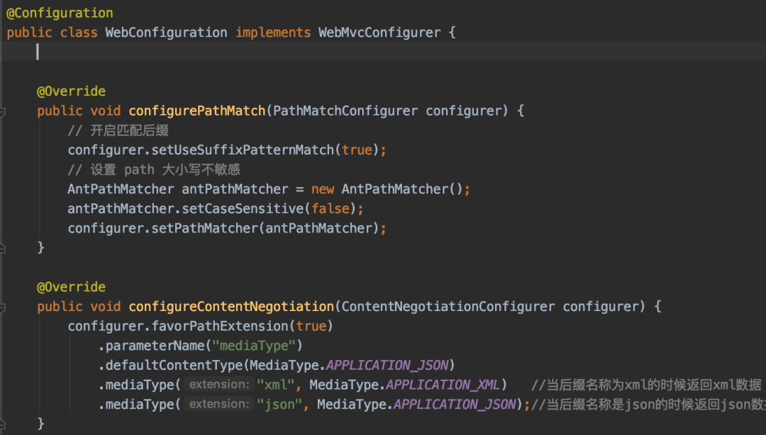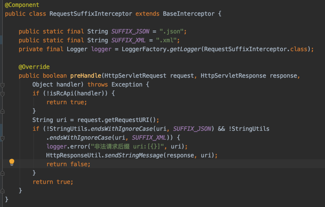于是笔者便开开心心的按照老系统的逻辑进行重构。根据需求接口返回类型需要根据请求后缀是json还是xml提供相应的返回数据格式。其他后缀结尾的或者没有后缀的返回错误码。笔者当时想到两种方案。一种是直接在@RequestMapping注解中通过value设置支持的后缀格式。如:@RequestMapping(value = {"/ping.json", "/ping.xml"}, method = RequestMethod.GET)。另一种是在@RequestMapping中不设置后缀如图一。通过实现WebMvcConfigurer配置类。实现configurePathMatch方法开启后缀匹配。实现configureContentNegotiation方法根据后缀进行返回格式设置如图二。然后再写个拦截器对非json和xml结尾的请求进行拦截如图三。为了简单少写代码。笔者选择了第二种方式实现。然后就开启了撸代码的模式。在完成所有开发任务,进入测试阶段时。测试小朋友跑过来跟我说:少年你重构的api性能不达标。现有的2核4G单机QPS能达到2000。你重构的只能达到七八百。当时内心数万个CNM在奔腾。