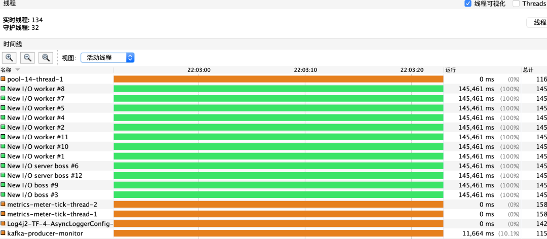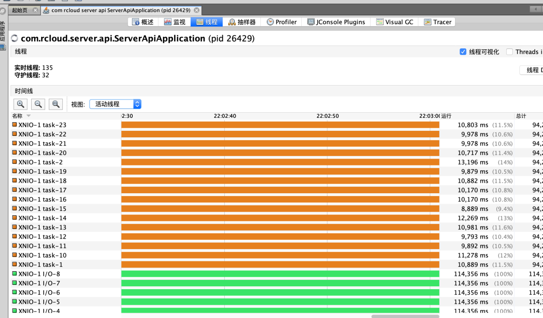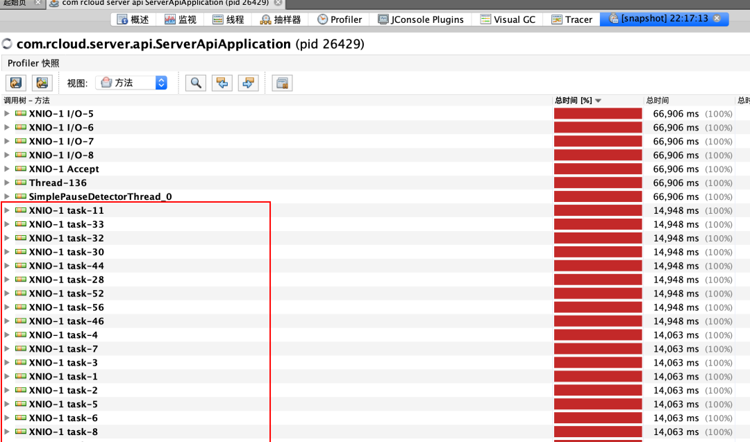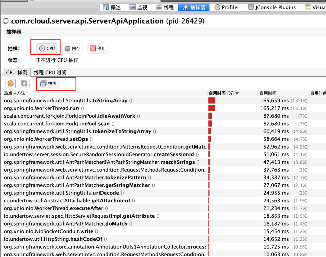 有过性能调优的同学应该都熟悉 jvisualvm,jdk自带监控程序。可以监控本地或远端cpu、内存、线程等实时动态信息。以及对线程进行快照。对线程内方法调用耗时统计等功能。非常强大。笔者用的是undertow作为web容器。可以看到图五、图六它有跟netty类似的IO模型,IO线程负责接收请求,然后把请求放到任务池中,由后面的任务线程进行处理。这也解释了为什么我之前用异步请求没有提升性能的原因。因为本身undertow已经是异步的了。自己再进行异步操作毫无意义。tomcat也是同样的道理。tomcat7以上默认支持NIO,所以自己再实现异步请求操作没有什么意义。
