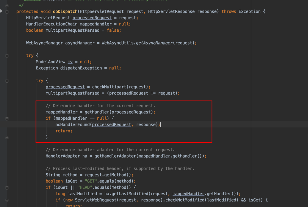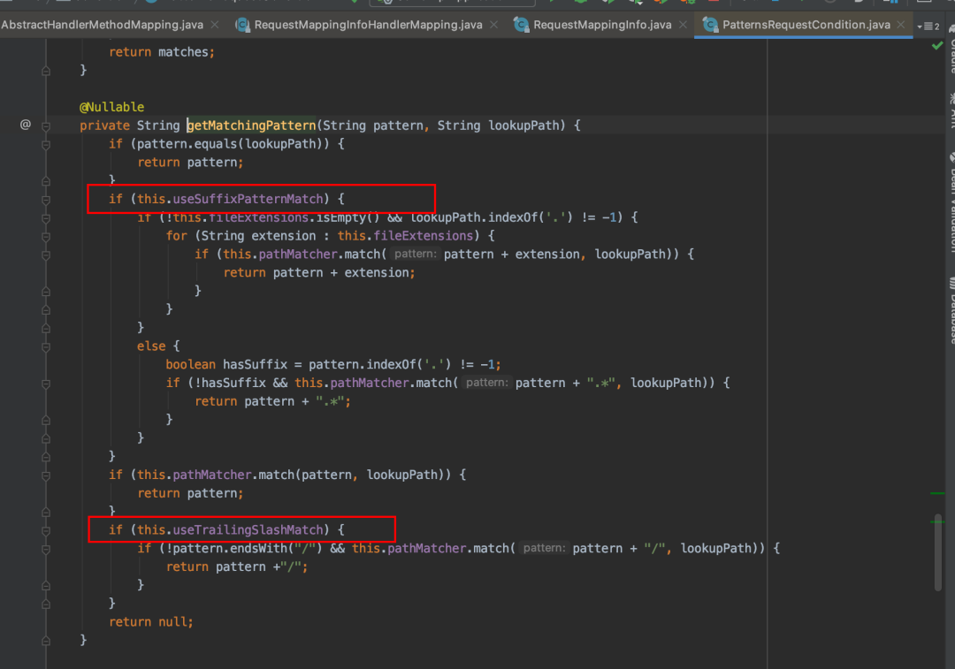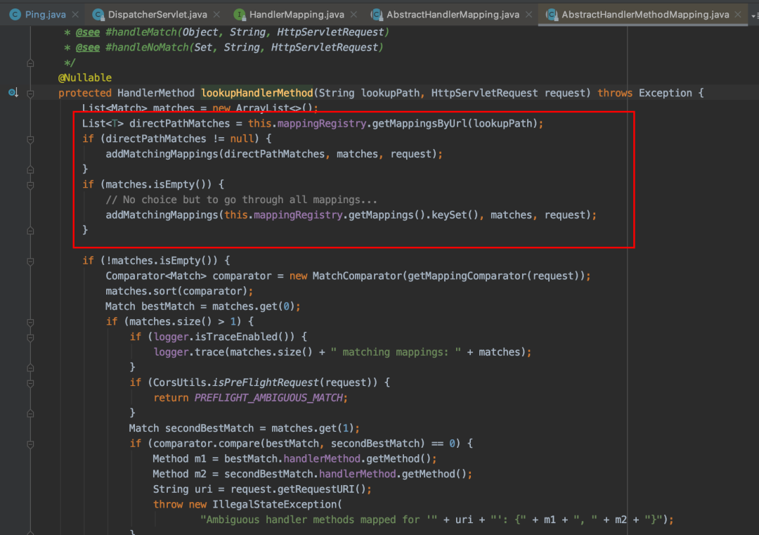 查看源码从doDispatch开始跟踪,发现当程序启动时会把@RequestMapping注解的path放到map集合中,当有请求时,先去map中获取对应的路径,如果有则返回方法,没有则根据设置的后缀匹配规则进行遍历匹配图十三。其中画框的属性是不是很熟悉。对,它就是实现WebMvcConfigurer时设置的配置。如写的是@RequestMapping(value = {"/ping"}, method = {RequestMethod.GET}) ,但请求的是/ping.json,第一次查找在集合中没有以/ping.json为path的方法,就会遍历所有路径集合进行拆分后缀匹配。直到匹配到为止。笔者的项目中有300个接口,500多个路径。如果不显示的给出后缀,每次请求都会遍历一遍这500多个路径,造成耗时。