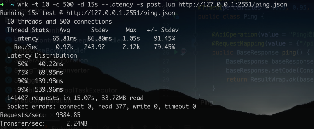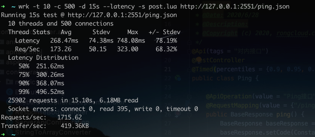 最后猜想是匹配路径耗时导致吞吐量变低。于是把注解中路径后缀显示给出@RequestMapping(value = {"/ping.json", "/ping.xml"}, method = {RequestMethod.GET}) , 再进行一次压测。结果QPS为9384,翻了4倍多。到此为止才算把性能提升上来。符合上线标准。