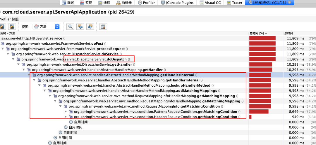 然后我用wrk命令进行压测,看下任务线程中哪些操作是比较耗时的,wrk -t 10 -c 500 -d 15s --latency -s http://127.0.0.1:2551/ping.json。10个线程500个连接,持续15秒。可以看到没有任何业务逻辑的接口QPS只有1715。对任务线程抽样进行快照如图八。展开其中一个线程任务图九。查看耗时的调用方法。如图十中DispatcherServlet在调用doDispatch方法占用了64.2%的时间。一个doDispatch怎么会用这么多的时间呢?继续追踪方法内调用getHander,最后耗时在getMatchingCondition中。