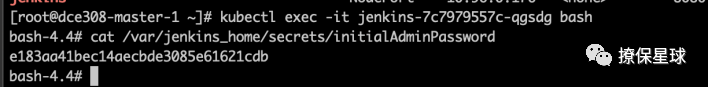 kubectl exec -it <jenkins_container> bash -c "cat var/jenkins_home/secrets/initialAdminPassword"