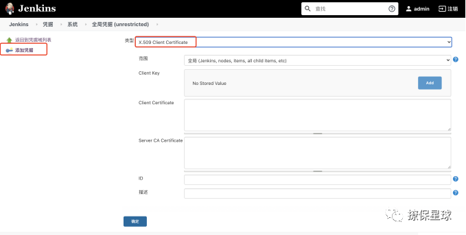添加凭据,类型选择 X.509 Client Certificate