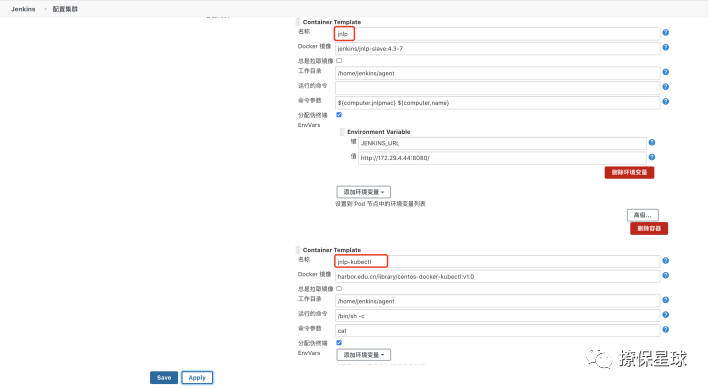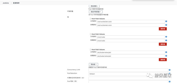 这边要注意,添加 2 个 container,第一个,Pod 内添加一个容器名称是 jnlp,Docker 镜像填写:jenkins/jnlp-slave:4.3-7,后面的使用默认的即可,然后在添加一个 container,容器名称是 jnlp-kubectl,是这个容器里面有 kubectl 的命令,镜像名称填写 harbor.edu.cn/library/centos-docker-kubectl:v1.0,下面增加了 Host Path Volume:/var/run/docker.sock、/root/.kube/、/etc/kubernetes/pki,这边便是为了 jenkins-slave 下有足够的权限可以执行 docker 及 kubectl 部署到 k8s 集群的权限,因为 jenkins-slave pod 有可能会被调度到任一 worker 节点,所以所有的 worker 节点上都必须有 root/.kube/、/etc/kubernetes/pki,配置好之后点击保存。