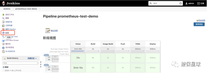 进入到 Jenkins 首页,点击项目 prometheus-test-demo,点击左侧 配置