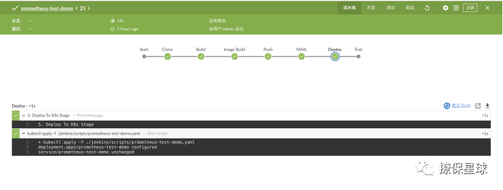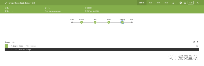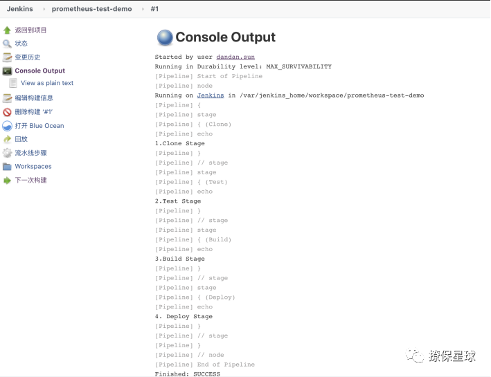 也可以在 Jenkins prometheus-test-demo 项目下,点击左侧菜单 立即构建,然后点击正在构建的任务,就可以看到 Console Output: