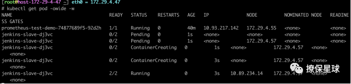 点击 立即构建,同时可以登录到k8s集群,使用 kubectl get po -w 可以看到 jenkins-slave pod 的生命周期,就是我们开始构建这个任务,选择了使用 jenkins slave,所以在执行过程中jenkins-slave就会自动创建,任务执行完成,jenkins-slave 对应的pod会自动回收: