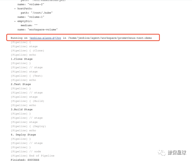 在构建日志里我们也可以看到 jenkins 启动了 jenkins-slave-dj3vc pod 进行这个任务的执行,也和上面的 pod 名称对应起来了。