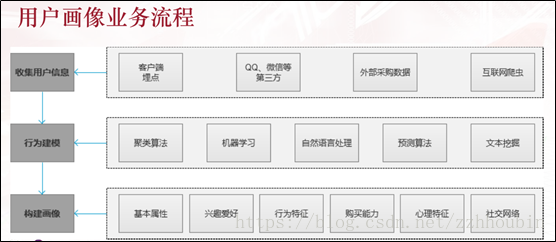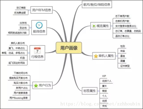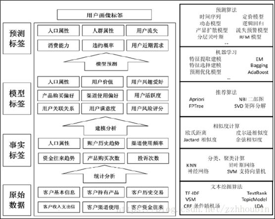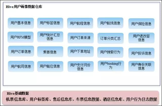 一般来说,根据具体的业务内容,会有不同的数据,不同的业务目标,也会使用不同的数据。在互联网领域,用户画像数据可以包括以下内容:(2)兴趣特征:浏览内容、收藏内容、阅读咨询、购买物品偏好等(4)位置特征:用户所处城市、所处居住区域、用户移动轨迹等(6)行为数据:访问时间、浏览路径等用户在网站的行为日志数据用户画像数据来源广泛,这些数据是全方位了解用户的基础,这里以Qunar的画像为例,其画像数据主要维度如下所示,包括用户RFM信息、航线信息等。Qunar的画像数据仓库构建都是基于Qunar基础数据仓库构建,然后按照维度进行划分。g) 个性化推荐、广告系统、活动营销、内容推荐、兴趣偏好六、 用户画像使用的技术方法