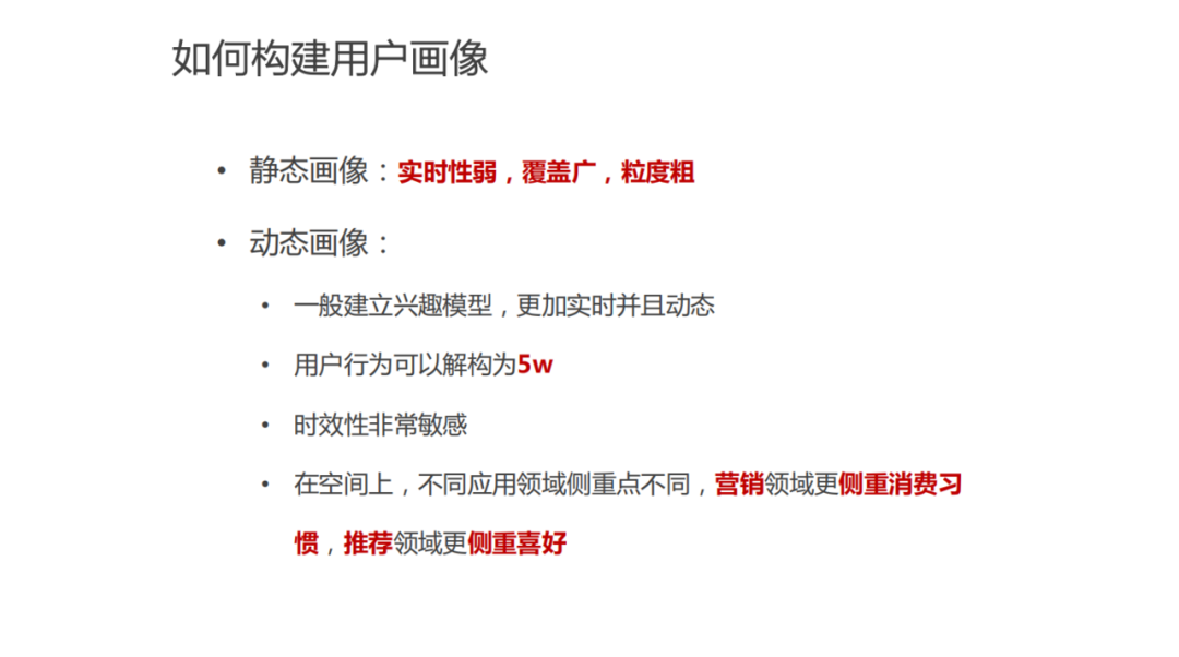 静态和动态的划分,其实是根据某个维度来定的,或者是在某个时间窗口内的。静态画像一般是实时性弱更新慢;动态画像变化相对更快一些,可以在时效性、空间上有差异。