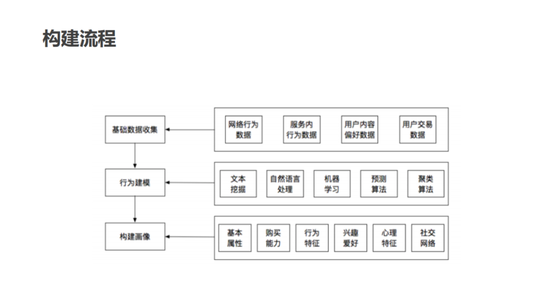 根据具体业务规则确定用户画像方向后,开展用户画像分析,总体来说,一个用户画像流程包括以下三步。(1)用户画像的基本方向;(2)用户数据收集;(3)用户标签建模。另外,需要注意的是用户画像的时效性,构建画像的数据多为历史数据,但用户的行为、偏好等特征多会随着时间的推移而发生变化。