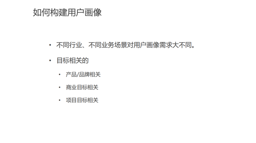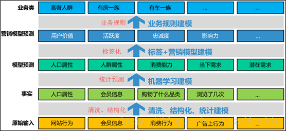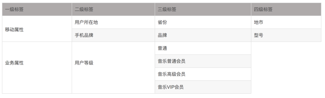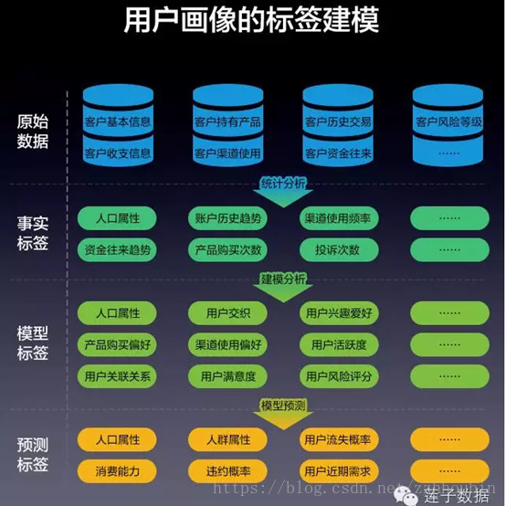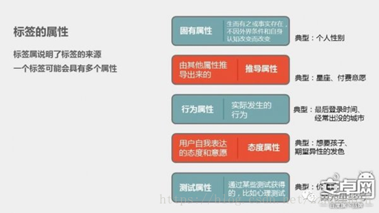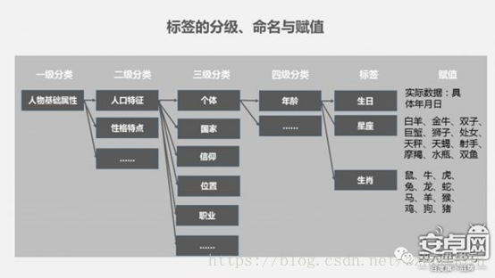 不同的行业,不同的业务,也会有不一样的构建目标和方式。在这个过程中,通过业务应用的要素分析,去驱动标签维度的扩展,然后通过标签维度的扩展。然后我又可以去驱动业务。用户画像是对现实用户做的一个数学模型,在整个数学模型中,核心是怎么描述业务知识体系,而这个业务知识体系就是本体论,本体论很复杂,我们找到一个特别朴素的实现,就是标签。标签是某一种用户特征的符号表示。是一种内容组织方式,是一种关联性很强的关键字,能方便的帮助我们找到合适的内容及内容分类。(注:简单说,就是你把用户分到多少个类别里面去,这些类是什么,彼此之间有什么关系,就构成了标签体系)标签解决的是描述(或命名)问题,但在实际应用中,还需要解决数据之间的关联,所以通常将标签作为一个体系来设计,以解决数据之间的关联问题。一般来说,将能关联到具体用户数据的标签,称为叶子标签。对叶子标签进行分类汇总的标签,称为父标签。父标签和叶子标签共同构成标签体系,但两者是相对概念。例如:下表中,地市、型号在标签体系中相对于省份、品牌,是叶子标签。用户画像标签体系创建后一般要包含以下几个方面的内容由于基于一个目标的画像,其标签是在动态扩展的,所以其标签体系也没有统一的模板,在大分类上,与自身的业务特征有很大的关联,在整体思路上可以从横纵两个维度展开思考:横向是产品内数据和产品外数据,纵向是线上数据和线下数据。而正中间则是永恒不变的“人物基础属性”。如果说其他的分类因企业特征而定,那么只有人物特征属性(至于名字叫什么不重要,关键是内涵)是各家企业不能缺失的板块。所谓人物基础属性指的是:用户客观的属性而非用户自我表达的属性,也就是描述用户真实人口属性的标签。所谓非“自我表达”,举例来说,某产品内个人信息有性别一项,用户填写为“女”,而通过用户上传的身份证号,以及用户照片,用户购买的产品,甚至用户打来的客服电话,都发现该用户性别是“男性”。那么在人物基础属性中的性别,应该标识的是“男性”,但是用户信息标签部分,自我描述的性别则可能标注为女性。分级有两个层面的含义,其一是:指标到最低层级的涵盖的层级;其二是指:指标的运算层级。其一非常好理解,这里重点说运算层级。标签从运算层级角度可以分为三层:事实标签、模型标签、预测标签。事实标签:是通过对于原始数据库的数据进行统计分析而来的,比如用户投诉次数,是基于用户一段时间内实际投诉的行为做的统计。模型标签:模型标签是以事实标签为基础,通过构建事实标签与业务问题之间的模型,进行模型分析得到。比如,结合用户实际投诉次数、用户购买品类、用户支付的金额等,进行用户投诉倾向类型的识别,方便客服进行分类处理。预测标签:则是在模型的基础上做预测,比如针对投诉倾向类型结构的变化,预测平台舆情风险指数。我们用一张图来说明一下命名和赋值的差别,只要在构建用户标签的过程种,有意识的区别标签命名和赋值足矣,不再赘述。标签属性可以理解为针对标签进行的再标注,这一环节的工作主要目的是帮助内部理解标签赋值的来源,进而理解指标的含义。如图所示,可以总结为5种来源:1、固有属性:是指这些指标的赋值体现的是用户生而有之或者事实存在的,不以外界条件或者自身认知的改变而改变的属性。比如:性别、年龄、是否生育等。2、推导属性:由其他属性推导而来的属性,比如星座,我们可以通过用户的生日推导,比如用户的品类偏好,则可以通过日常购买来推导。3、行为属性:产品内外实际发生的行为被记录后形成的赋值,比如用户的登陆时间,页面停留时长等。4、态度属性:用户自我表达的态度和意愿。比如说我们通过一份问卷向用户询问一些问题,并形成标签,如询问用户:是否愿意结婚,是否喜欢某个品牌等。当然在大数据的需求背景下,利用问卷收集用户标签的方法效率显得过低,更多的是利用产品中相关的模块做了用户态度信息收集。5、测试属性:测试属性是指来自用户的态度表达,但并不是用户直接表达的内容,而是通过分析用户的表达,结构化处理后,得出的测试结论。比如,用户填答了一系列的态度问卷,推导出用户的价值观类型等。值得注意的是,一种标签的属性可以是多重的,比如:个人星座这个标签,既是固有属性,也是推导属性,它首先不以个人的意志为转移,同时可以通过身份证号推导而来。即便你成功了建立用户画像的标签体系,也不意味着你就开启了用户画像的成功之路,因为有很大的可能是这些标签根本无法获得,或者说无法赋值。标签无法赋值的原因有:数据无法采集(没有有效的渠道和方法采集到准确的数据,比如用户身份证号)、数据库不能打通、建模失败(预测指标无法获得赋值)等等。主要指用户的历史数据信息,如会员信息、消费信息、网络行为信息。经过数据的清洗,从而达到用户标签体系的事实层。事实层是用户信息的准确描述层,其最重要的特点是,可以从用户身上得到确定与肯定的验证。如用户的人口属性、性别、年龄、籍贯、会员信息等。通过利用统计建模,数据挖掘、机器学习的思想,对事实层的数据进行分析利用,从而得到描述用户更为深刻的信息。如通过建模分析,可以对用户的性别偏好进行预测,从而能对没有收