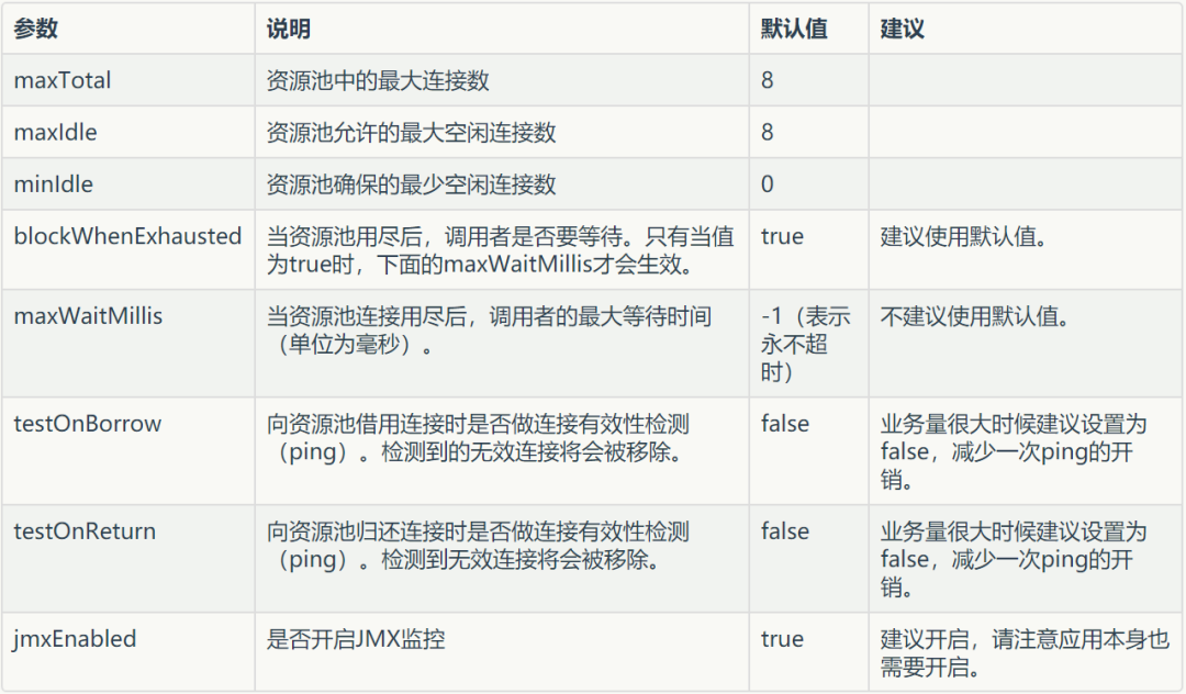 JedisPoolConfig config = new JedisPoolConfig();//可用连接实例的最大数目,默认为8;//如果赋值为-1,则表示不限制,如果pool已经分配了maxActive个jedis实例,则此时pool的状态为exhausted(耗尽)private Integer MAX_TOTAL = 1024;//控制一个pool最多有多少个状态为idle(空闲)的jedis实例,默认值是8private Integer MAX_IDLE = 200;//等待可用连接的最大时间,单位是毫秒,默认值为-1,表示永不超时。//如果超过等待时间,则直接抛出JedisConnectionExceptionprivate Integer MAX_WAIT_MILLIS = 10000;//在borrow(用)一个jedis实例时,是否提前进行validate(验证)操作;//如果为true,则得到的jedis实例均是可用的private Boolean TEST_ON_BORROW = true;//在空闲时检查有效性, 默认falseprivate Boolean TEST_WHILE_IDLE = true;//是否进行有效性检查private Boolean TEST_ON_RETURN = true;config.setMaxTotal(MAX_TOTAL);config.setMaxIdle(MAX_IDLE);config.setMaxWaitMillis(MAX_WAIT_MILLIS);config.setTestOnBorrow(TEST_ON_BORROW);config.setTestWhileIdle(TEST_WHILE_IDLE);config.setTestOnReturn(TEST_ON_RETURN);Set<HostAndPort> jedisClusterNode = new HashSet<HostAndPort>();jedisClusterNode.add(new HostAndPort("192.168.0.31", 6380));jedisClusterNode.add(new HostAndPort("192.168.0.32", 6380));jedisClusterNode.add(new HostAndPort("192.168.0.33", 6380));jedisClusterNode.add(new HostAndPort("192.168.0.34", 6380));jedisClusterNode.add(new HostAndPort("192.168.0.35", 6380));JedisCluster jedis = new JedisCluster(jedisClusterNode, 1000, 1000, 5, config);