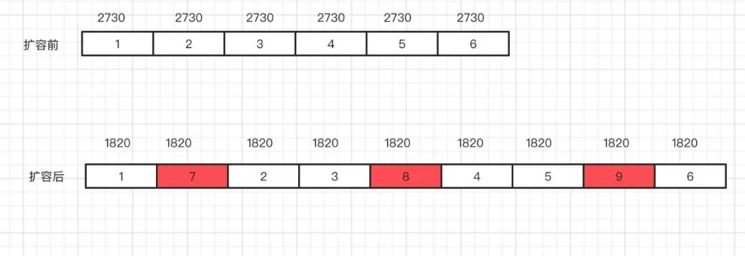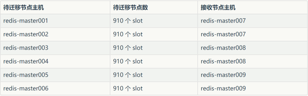 为保证扩容后,槽依然均匀分布,需要将之前 6 台的每台机器上迁移出 910 个槽,方案如下: