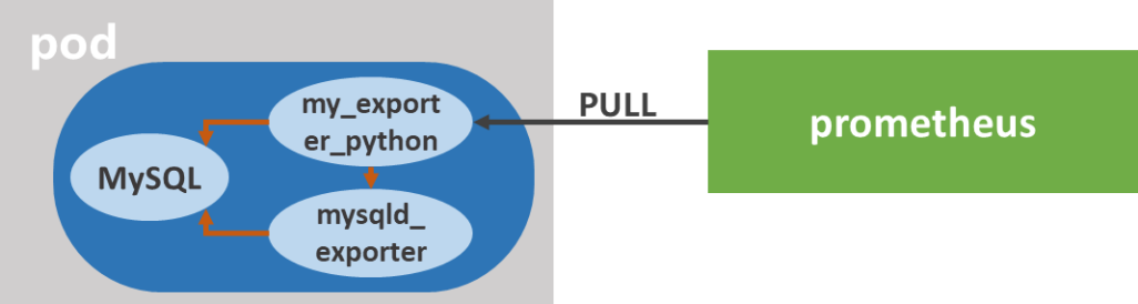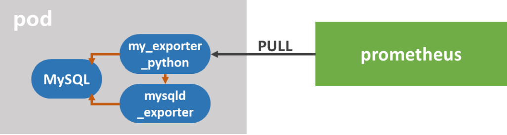 MySQL、mysqld_exporter、my_exporter_python监控脚本分别属于不同的镜像,MySQL主容器与监控容器按顺序运行。监控容器以sidecar的方式访问MySQL。