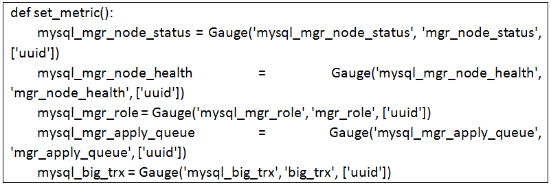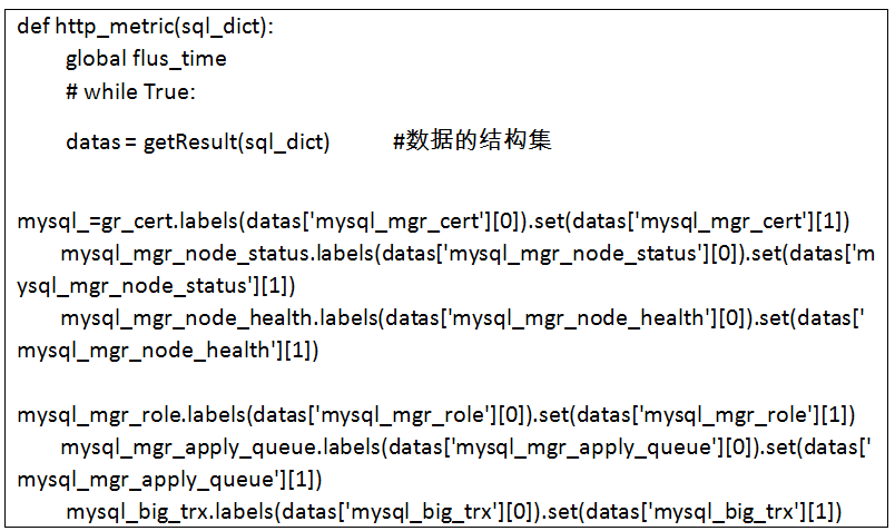 方案改进:prometheus提供了client libraries,可实现对监控指标进行定制化采集。故可用python语言定制脚本的方式采集MGR相关数据。mysqld_exporter与python脚本能够满足全部监控信息的导出。
