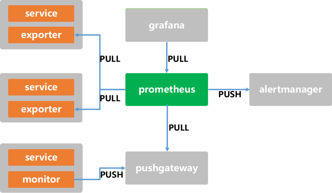 Exporters(导出器):主要是作为agent收集数据发送到prometheus server,不同的数据收集由不同的exporters实