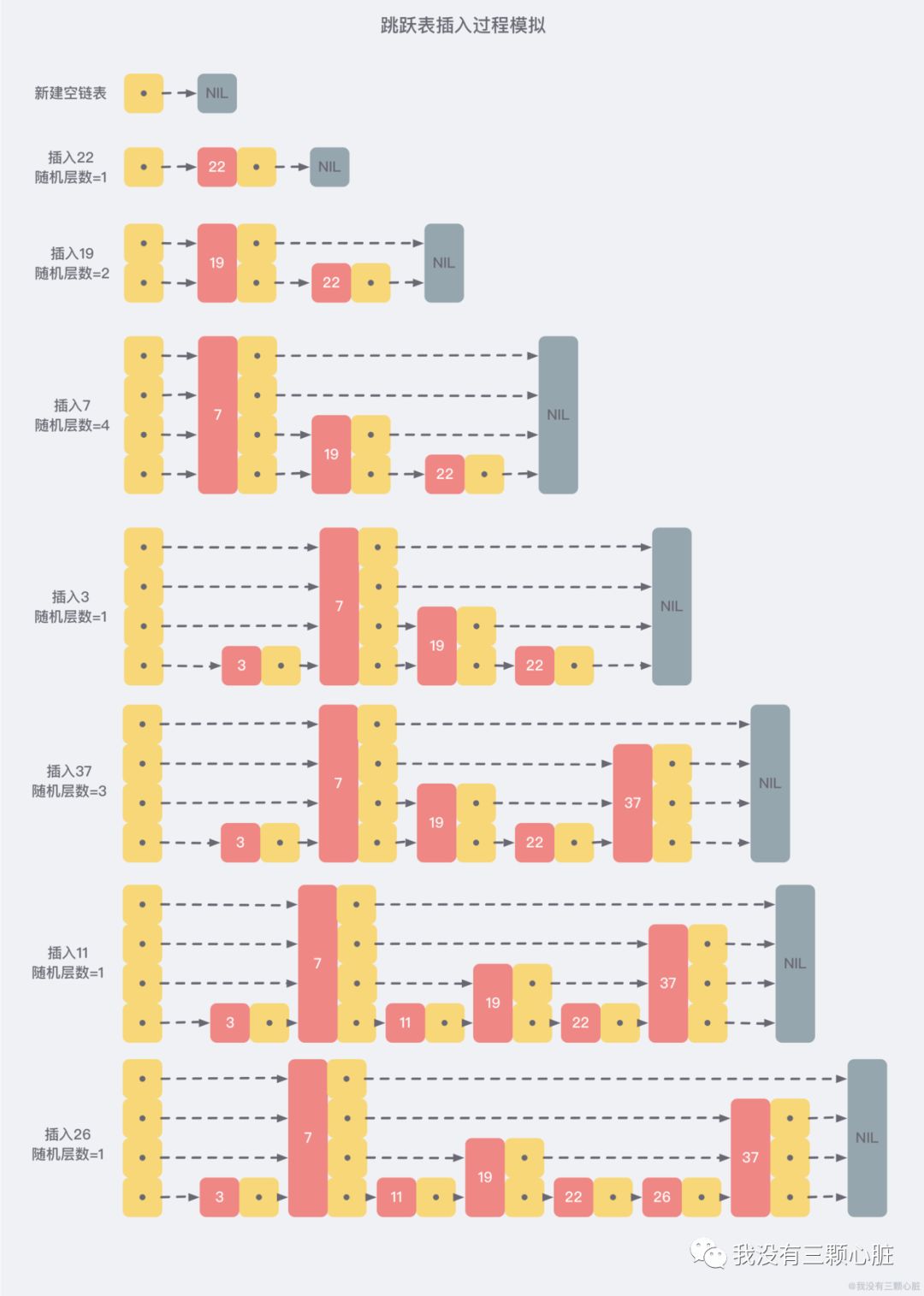 skiplist 为了避免这一问题,它不要求上下相邻两层链表之间的节点个数有严格的对应关系,而是 为每个节点随机出一个层数(level)。比如,一个节点随机出的层数是 3,那么就把它链入到第 1 层到第 3 层这三层链表中。为了表达清楚,下图展示了如何通过一步步的插入操作从而形成一个 skiplist 的过程: