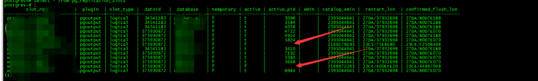 postgres=# select *from pg_replication_slots WHERE slot_name='sub_user1';-[ RECORD 1 ]-------+-----------slot_name | sub_user1plugin | pgoutputslot_type | logicaldatoid | 16386database | mydbtemporary | factive | factive_pid |xmin |catalog_xmin | 549020restart_lsn | 1/17E06270confirmed_flush_lsn | 1/17E062A8wal_status | normalmin_safe_lsn |