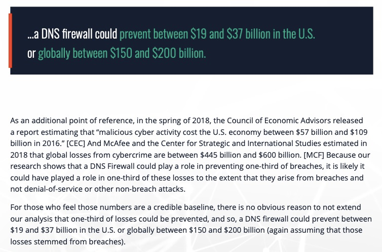 全球网络联盟(GCA)在2019年发布的《DNS安全的经济价值》报告称,防护性DNS的安全控制,可以每年为美国省下190-370亿美元损失,全球而言,该数字是1500-2000亿美元。