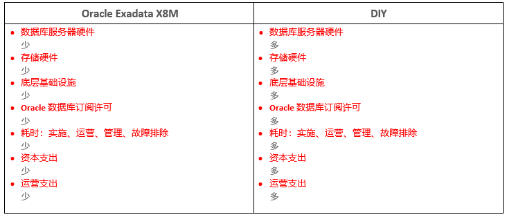 我们来客观地分析一下。如果您是一位 IT 专业人员,正在尝试或考虑组装一个 Oracle 数据库 DIY 系统或任何其他数据库 DIY 系统……请立即停止 !请您停下手中的工作,喘口气,然后仔细阅读本文档。如今,构建一个 DIY 数据库系统需要投入大量人力和物力,尤其是时间和资金。而 Exadata X8M 能够以更简单的打包方式提供更高水平的性能和自动化功能,大幅降低总成本,全方位碾压其他数据库系统或 DIY 数据库系统。欢迎阅读本文档了解具体原因。