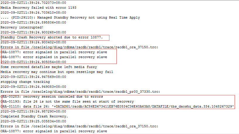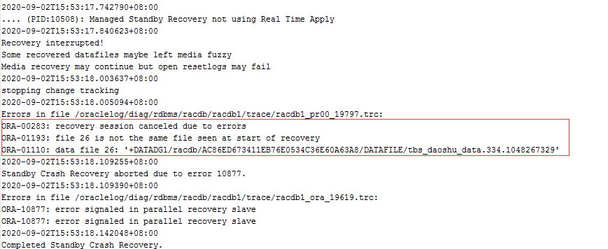 1、查看备库dbalert日志发现报ORA-01193:file 26 is not the same file seen at start of recovery。