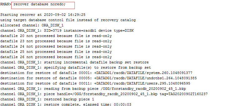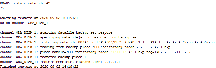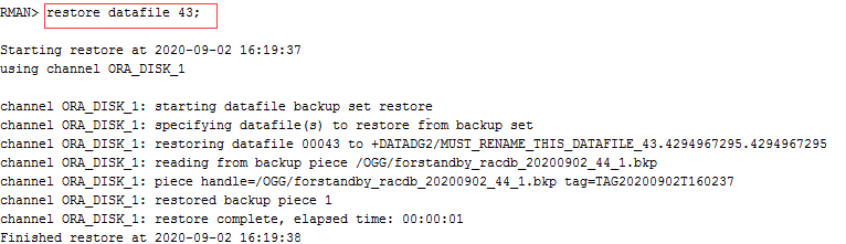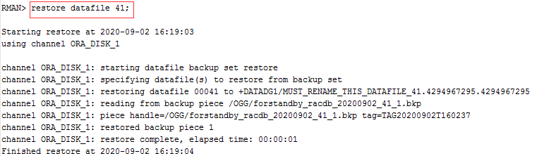 10、由于新增数据文件41、42及43在备库不存在,需要先restore,如果直接recover会报错。