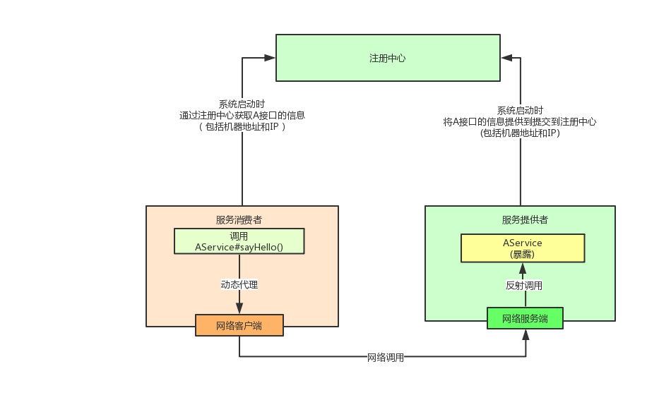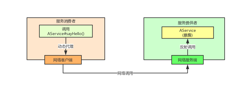 那他们是如何做到的呢?当我们的服务消费者调用某个 RPC 接口的方法之后,它的底层会通过动态代理,然后经过网络调用,去到服务提供者的机器上,然后执行对应的方法。