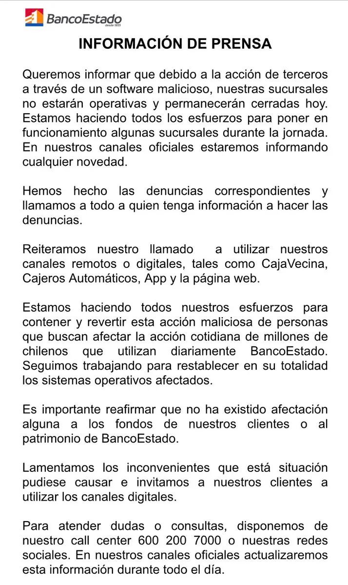 智利国家银行(BancoEstado)的所有分行在9月7日周一仍处于关闭状态,可能还要停业多日。智利三大银行之一国家银行在上周末遭到勒索软件攻击后,周一被迫关闭了所有分行。该银行周一在其推特帐户上发布的一份声明中说:“我们的分行无法运营,今天仍处于关闭状态。”有关攻击的细节尚未公之于众,但了解调查情况的消息人士告诉IT外媒ZDNet,该银行的内部网络感染上了REvil(Sodinokibi)勒索软件。目前初步调查后发现,该事件源自一名员工收到并打开了一份恶意Office文档。据信,该恶意Office文件在这家银行的网络上植入了后门。调查人员认为,在周五至周六之间的晚上,黑客利用该后门访问了银行的网络,并安装了勒索软件。周末轮班的银行员工在周六无法访问工作文件后发现了这起攻击。国家银行向智利警方报告了这起事件。就在同一天,智利政府发布全国性网络安全警报,提醒防范针对私营部门的勒索软件活动。据消息人士声称,虽然最初该银行希望在不被人注意的情况下在攻击后恢复过来,但遭到了严重破坏,勒索软件对绝大多数内部服务器和员工工作站进行了加密。该银行最初在周日披露了攻击事件,但银行官员后来意识到了员工周一无法工作,于是决定在恢复期间让分行处于关闭状态。幸好,该银行似乎做了该做的工作,对内部网络进行了适当的分隔,因而限制了黑客可以加密的内容。据该银行发布的多份声明显示,该银行的网站、银行门户网站、移动应用程序和ATM均未受影响,向客户保证他们的资金很安全。REvil勒索软件团伙是少数几个运行泄露网站的组织之一,它在该网站上泄露来自从其闯入的网络的文件,以防受害者不愿支付赎金。截至本文发稿时,国家银行的名称不在泄露网站上,这表明该银行不是支付了赎金,就是仍在与黑客进行谈判。这已是黑客第二次攻击智利银行。2018年6月,朝鲜黑客在企图隐藏银行黑客活动的同时,在智利银行的网络上部署了清除磁盘内容的恶意软件。一年后,这伙黑客还在企图实施ATM提现诡计时闯入了Redbanc,该公司将所有智利银行的ATM基础设施互连起来。