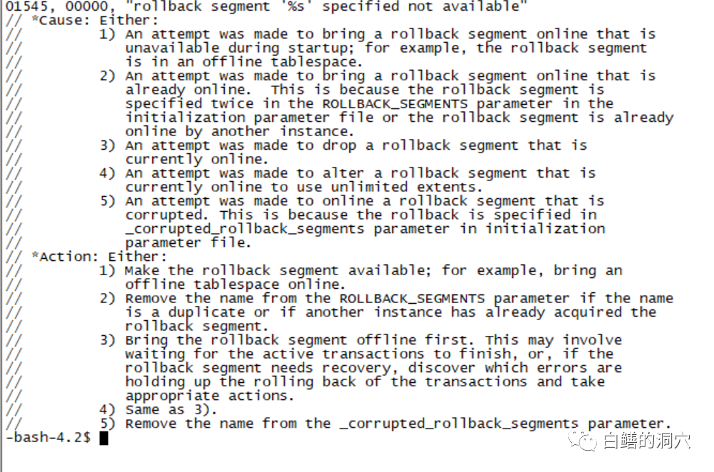 看Oracle的错误文件,这个错误是因为回滚段出现问题导致的。一般情况下,如果我们在数据库实例启动的时候发现有ORA-1545,那么我们需要首先把数据库启动到mount 状态,然后检查v$datafile,看看是不是有数据文件处于OFFLINE状态。如果存在OFFLINE的文件,那么就对该文件执行ONLINE操作。如果这个步骤做完后,该问题已经解决,那么就恭喜你,你已经遇到了最为简单的情况(有些情况下,执行alter database datafile ... online操作可能会报失败,不过不要着急,有可能此时你打开数据库的时候,这个故障已经消失了)。如果处于offline的文件物理不存在了,那么你可能就遇到了大麻烦,处理丢失的文件暂时不在我们今天的讨论范围。如果上面的操作没有解决问题,那么下一步我们就需要来分析到底那个rbs存在问题。此时,设置10013/10015这两个EVENT是最为有效的方法。10013事件的作用是在数据库实例启动的时候DUMP出实例recovery阶段使用到的rbs的名称,10015事件的作用是在实例启动的时候DUMP出实例recovery阶段使用到的回滚段头的信息。通过这个信息我们可以发现存在问题的事务槽。event = "10013 trace name context forever, level 10"event = "10015 trace name context forever, level 10"