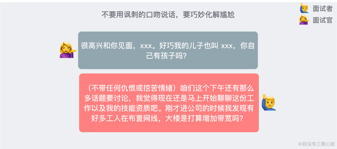 千万别用讽刺的口吻说话。不要让自己听起来充满了侵略性或是把面试官置于一个下不来台的境地。