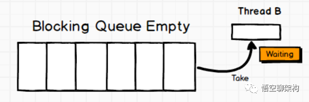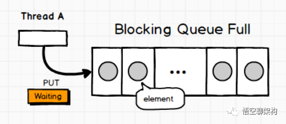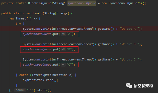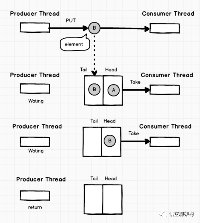 小结:说明生产线程执行put第一个元素"A" 操作后,需要等待消费者线程take完“A”后,才能继续往下执行代码。