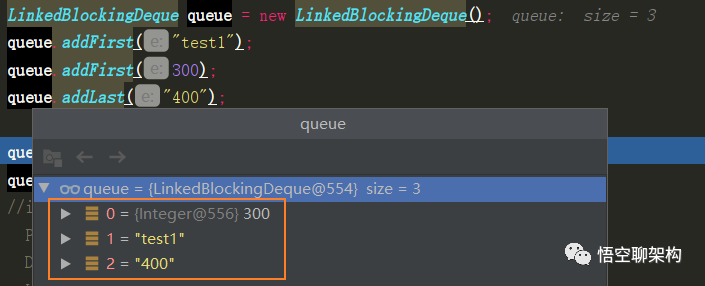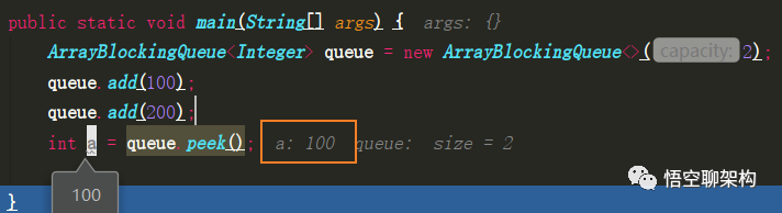 注意:peek方法不论是作为栈还是队列,都是从队列的检测队列的头,返回最先加入的元素。比如第一次put 100,第二次put 200,则peek返回的是100。如下图所示: