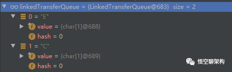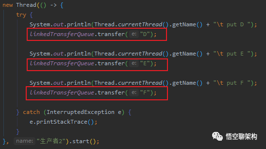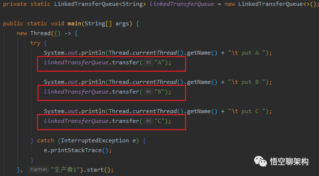 创建一个LinkedTransferQueue,生产者1 依次往队列中添加 A、B、C
