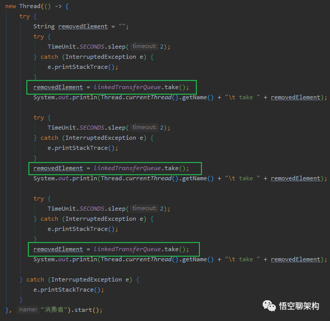 消费者依次从队列首部开始消费元素,每次消费前,先sleep 2s,来演示transfer方法是否进行了等待。