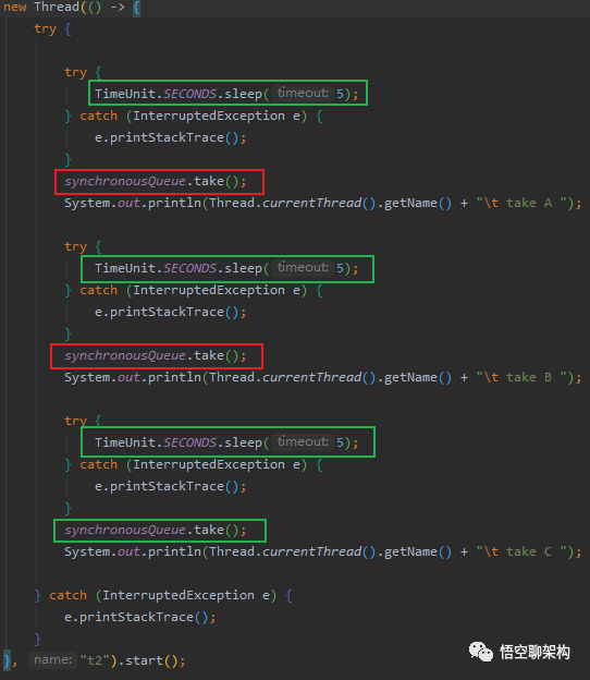 消费线程使用take来消费阻塞队列中的内容,每次消费前,等待5秒