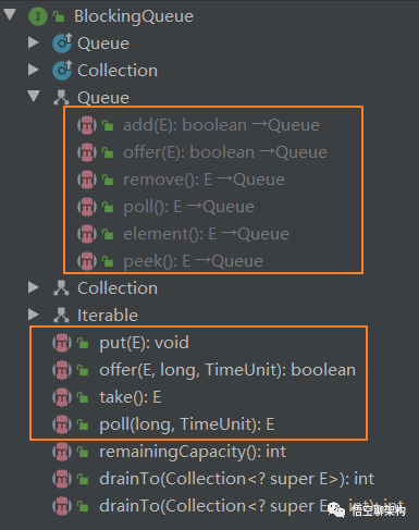 (4)Queue接口没有定义阻塞队列的方法,这些方法在BlockQueue接口中定义了。