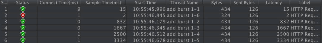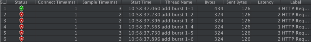 我们使用单 IP 在 10ms 内发并发送了 6 个请求的执行结果如下: