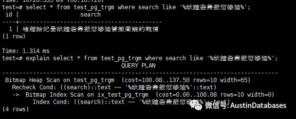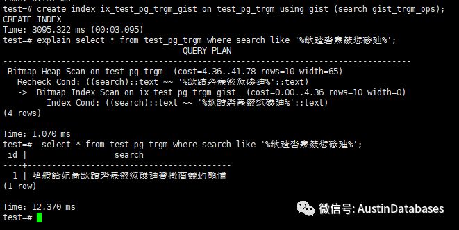 下面也做一个测试,(但不证明GIN 比 GIST 性能强),我们建立一个gist的索引,也提通过查询来进行模糊方式的查询